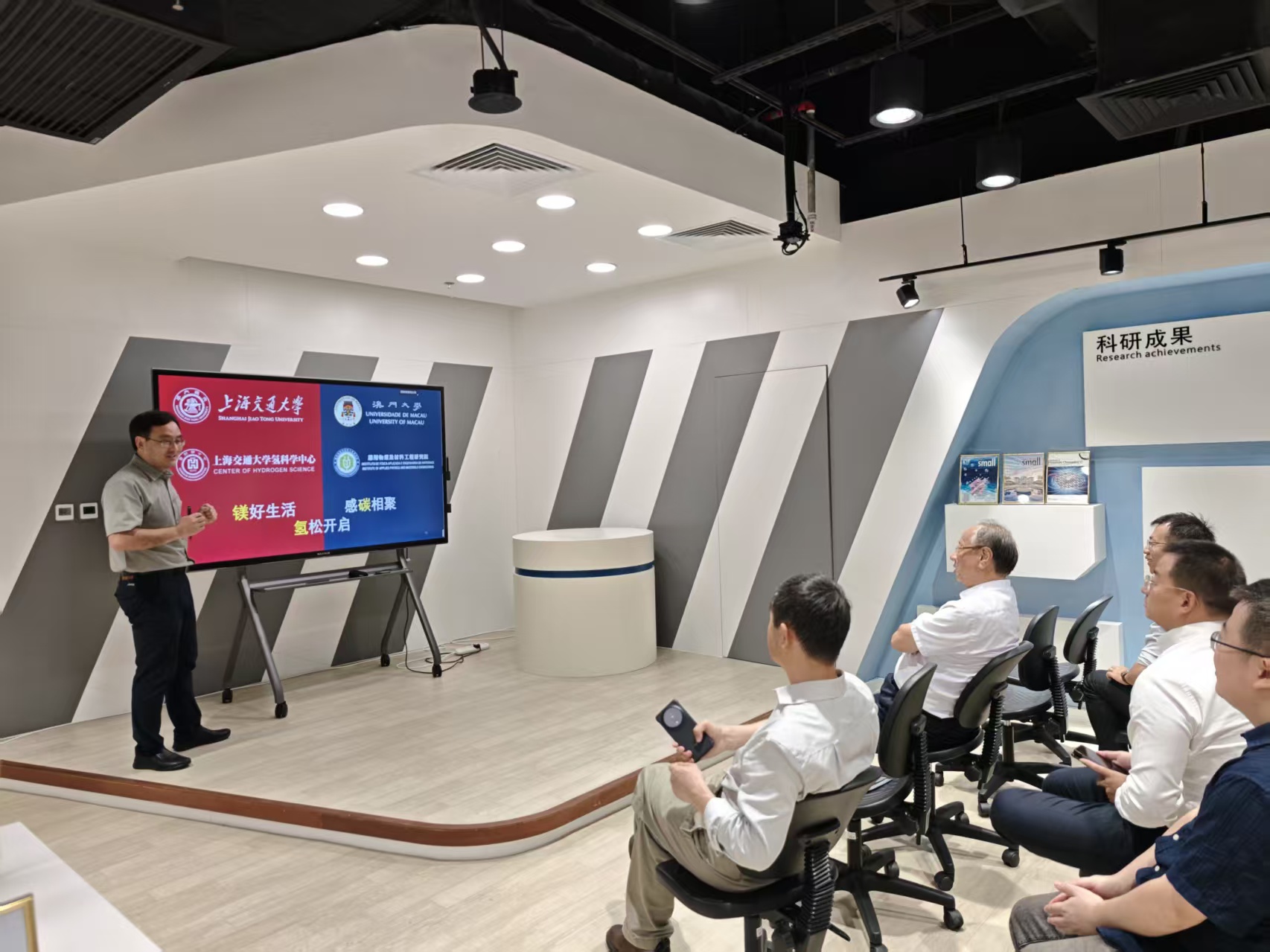 In the morning of 7 August 2025, Academician Wenjiang Ding (丁文江) and Dean Qing Dai (戴慶), led a delegation from the School of Materials Science and Engineering, the Hydrogen Science Center of Shanghai Jiao Tong University to visit the Institute of Applied Physics and Materials Engineering (IAPME) at the University of Macau. Prof. Handong Sun presented an overview of IAPME’s research activities, followed by research reports from Prof. Guoxing Sun and Prof. Songnan Qu. Academician Ding outlined the strategic directions of SJTU’s Hydrogen Science Center and expressed a strong interest in deepening collaboration with IAPME in the fields of hydrogen energy, hydrogen medicine, and hydrogen health.