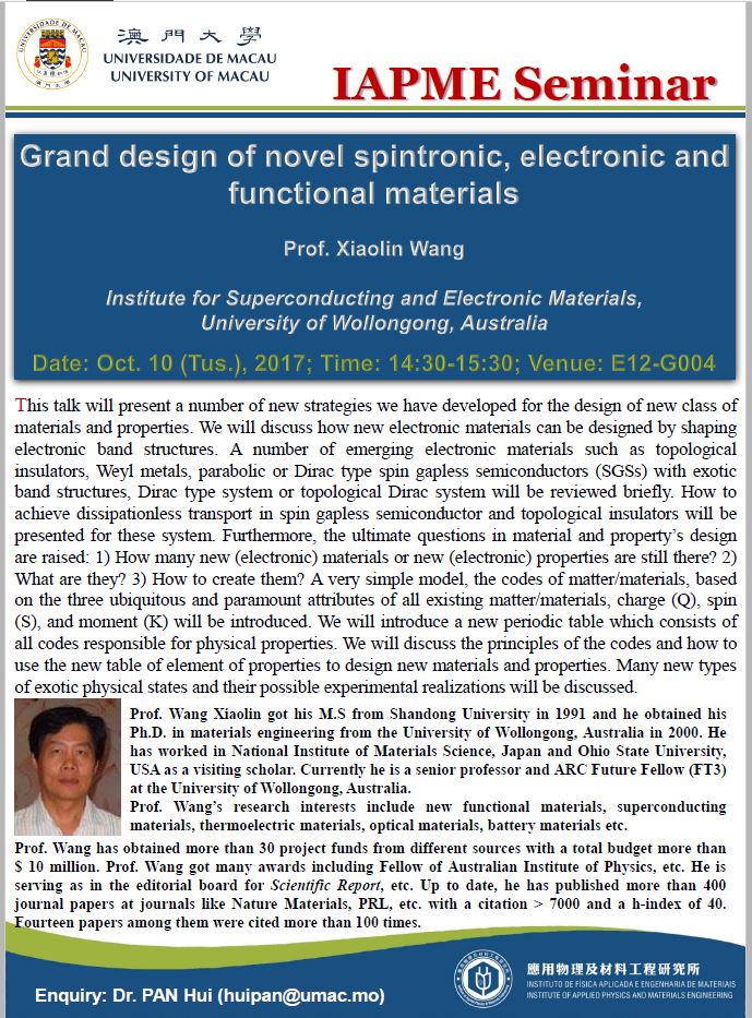Prof. Xiaolin Wang from University of Wollongong, Australia will give IAPME invited seminar talks as following.