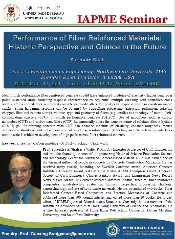 Prof.  Surendra Shah from Northwestern University, USA will give IAPME invited seminar talk as following.