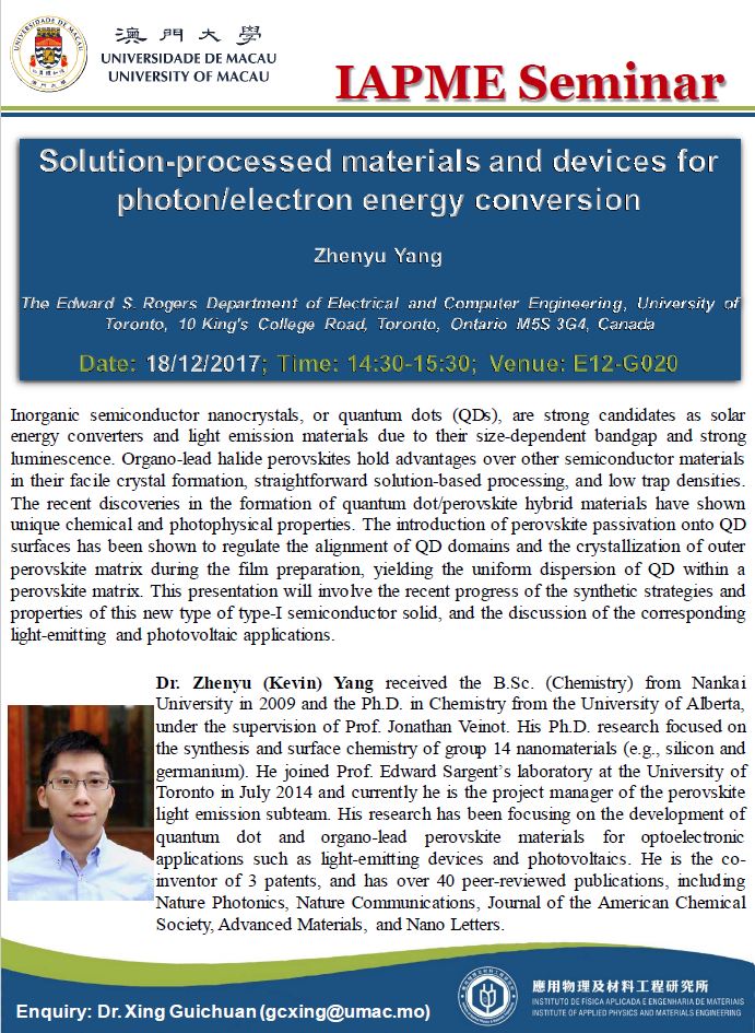 Dr. Zhenyu Yang from University of Toronto, Canada will give IAPME invited seminar talk as following.