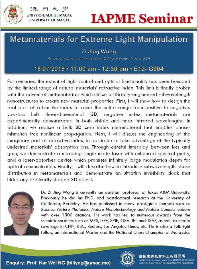 Prof. Zi Jing Wong will give a talk to IAPME. Here is the information,