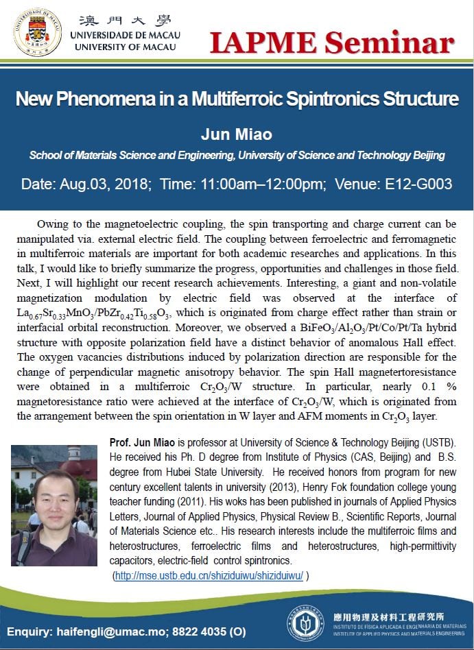 Prof. Jun Miao will give a talk to IAPME. Here is the information,