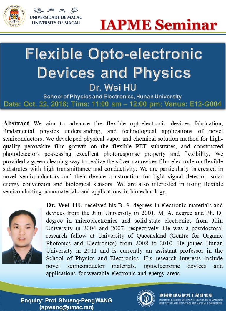 Prof. Wei Hu will give a talk to IAPME. Here is the information,