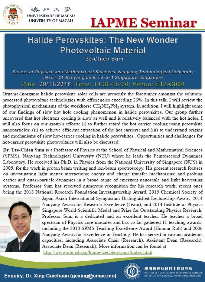Prof. Tze-Chien SUM will give a talk to IAPME. Here is the information,