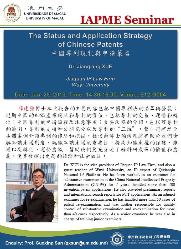 Dr. Jianqiang XUE will give a talk to IAPME. Here is the information,