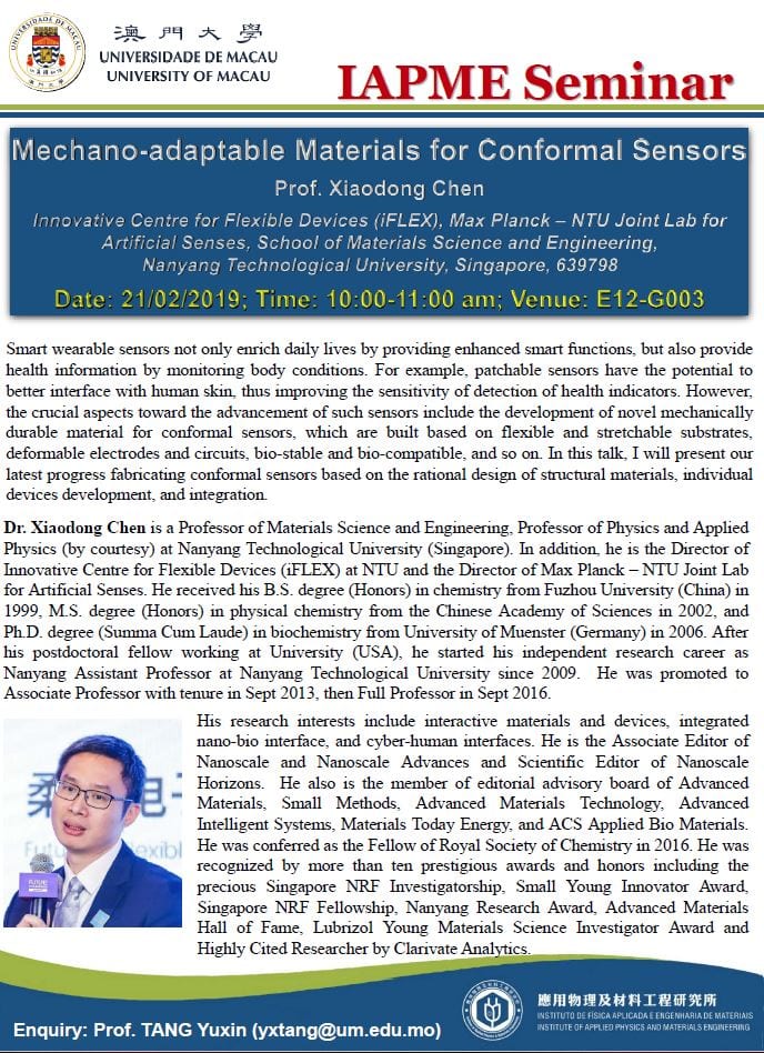 Prof. Xiaodong CHEN will give a talk to IAPME. Here is the information,
