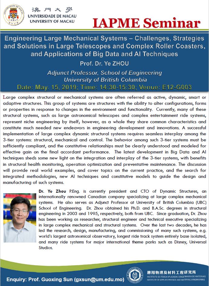 Prof. Dr. Ye ZHOU will give a talk to IAPME. Here is the information,
