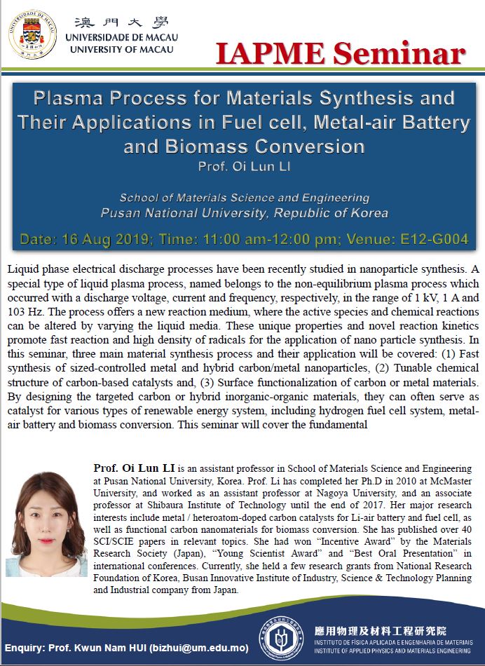 Prof. Oi Lun LI will give a talk to IAPME. Here is the information,
