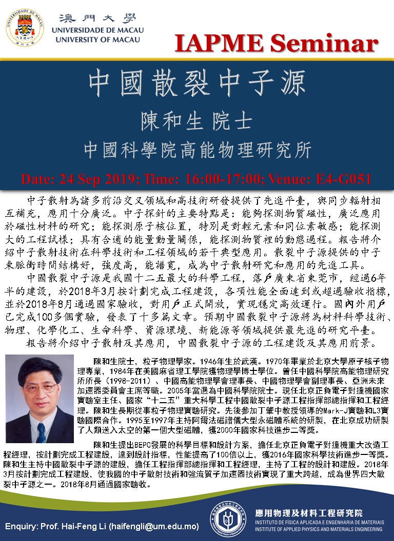 Prof. Hesheng CHEN will give a talk to IAPME. Here is the information,