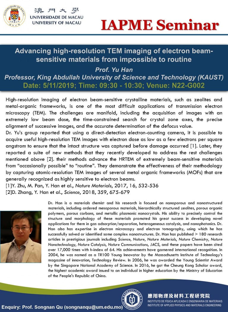 Prof. Yu HAN will give a talk to IAPME. Here is the information,