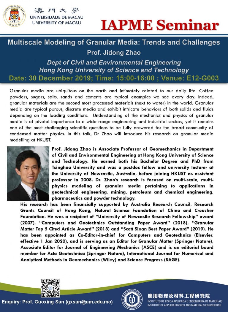 Prof. Jidong ZHAO will give a talk to IAPME. Here is the information,