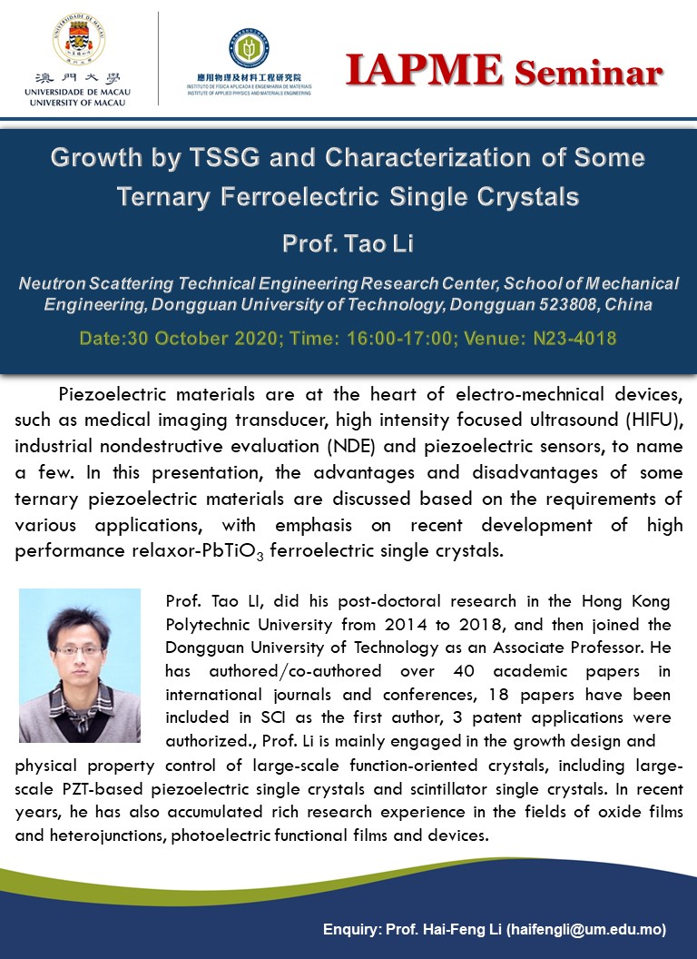 Prof. Tao LI will give a talk to IAPME. Here is the information,