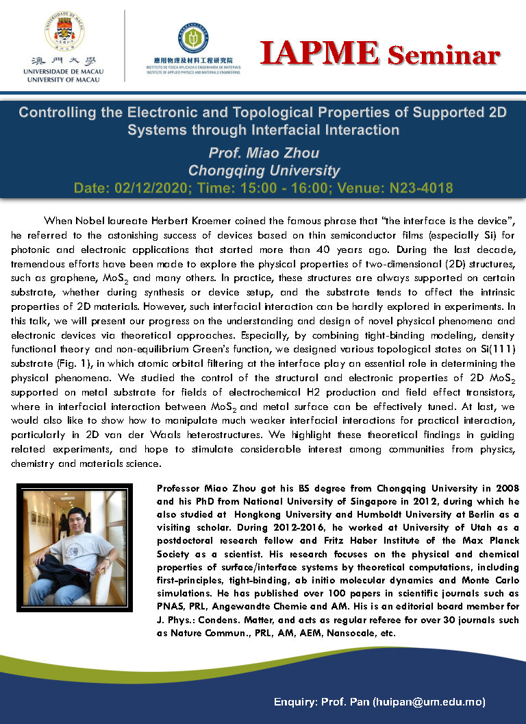 Prof. Miao Zhou will give a talk to IAPME. Here is the information,