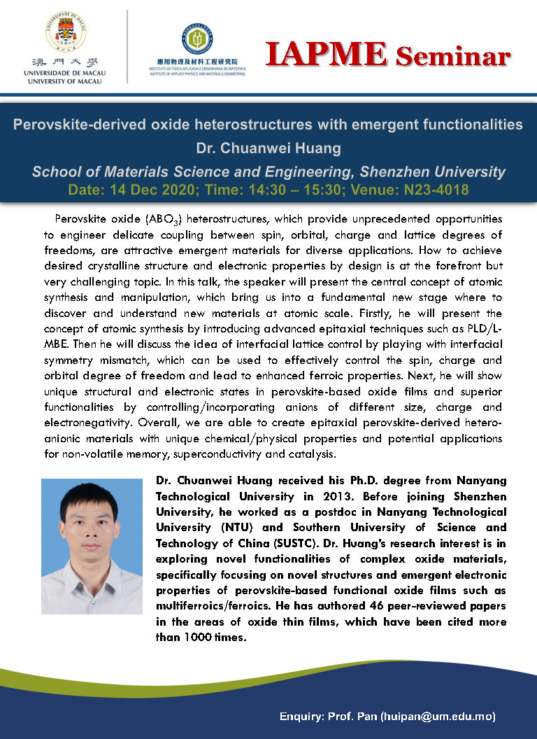Dr. Chuanwei HUANG will give a talk to IAPME. Here is the information,