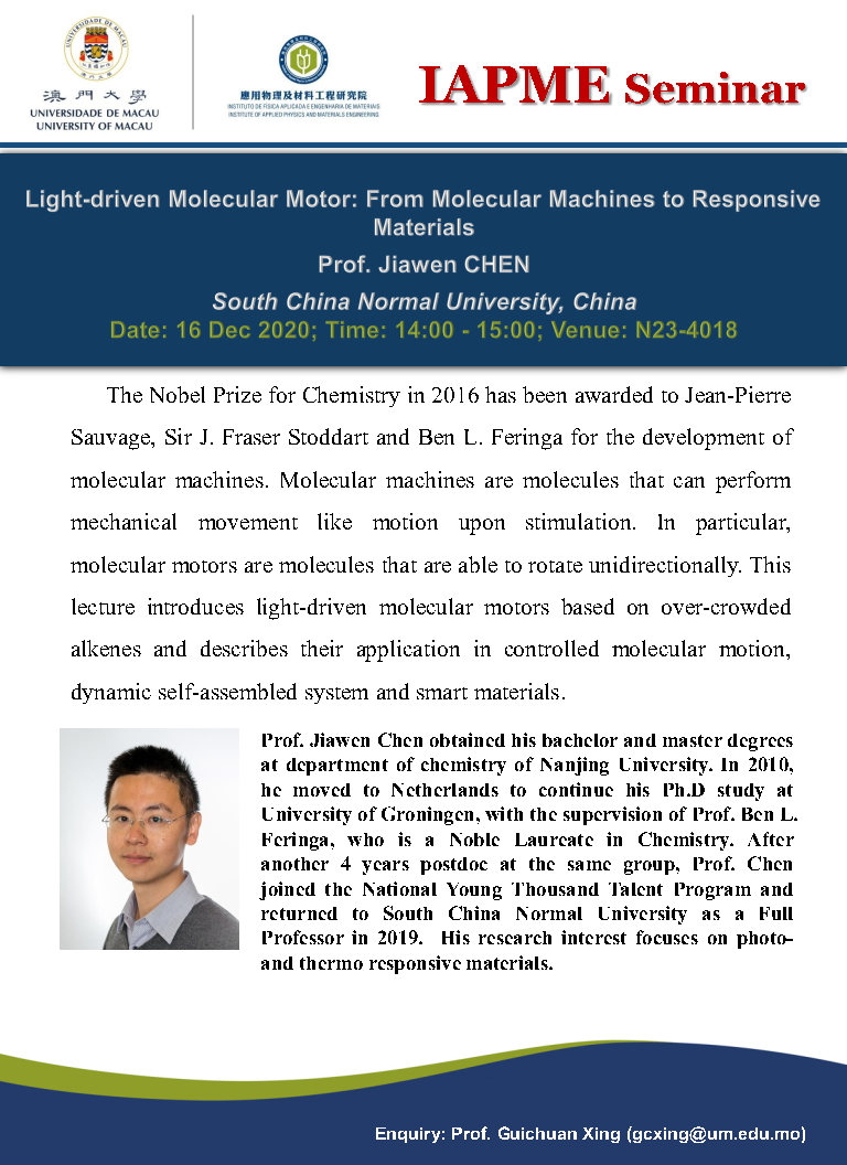 dicksonlao Lao Si Chon2020-12-15T11:43:05+08:002020-12-15|活動| 陳家文教授將於IAPME演講,詳情如下: 主題: 光驅動分子馬達:從分子機器到響應材料 日期: 16 Dec 2020 時間: 2:00 pm – 3:00 pm 地點: N23-4018 查詢: gcxing