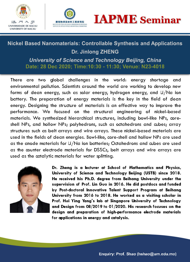 dicksonlao Lao Si Chon2020-12-18T15:02:16+08:002020-12-18|Seminar, 活動| 鄭金龍博士將於IAPME演講,詳情如下: 主題: 鎳基納米材料的可控制備及應用 日期: 28 Dec 2020 時間: 10:30 am – 11:30 am 地點: N23-4018 查詢: hshao