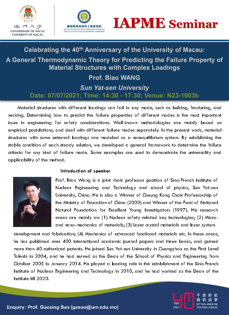 Title: Celebrating the 40th Anniversary of the University of Macau: A General Thermodynamic Theory for Predicting the Failure Property of Material Structures with Complex Loadings