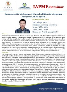 dicksonlao Lao Si Chon2025-11-26T16:36:24+08:002025-11-26|Seminar, 活動| 陳兵教授將於IAPME演講,詳情如下: 主題: 磷酸鎂水泥體系中礦物摻合料作用機理研究 日期: 3 Dec 2025 時間: 10:00 – 11:00 地點: N23-1004b 查詢: iapme.enquiry