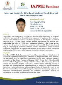 dicksonlao Lao Si Chon2025-11-26T16:21:17+08:002025-11-26|Seminar, 活動| 王心醉教授將於IAPME演講,詳情如下: 主題:面向中醫智能養老與養生平台的集成解決方案 日期: 5 Dec 2025 時間: 10:00 – 10:40 地點: N23-4018 查詢: iapme.enquiry