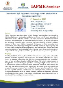 dicksonlao Lao Si Chon2025-12-03T13:00:57+08:002025-12-03|Seminar, 活動| 楊明來教授將於IAPME演講,詳情如下: 主題: 激光光源調控技術及其在溫室農業中的應用 日期: 17 Dec 2025 時間: 14:00 – 15:00 地點: N23-4018 查詢: iapme.enquiry