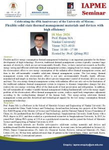 dicksonlao Lao Si Chon2026-04-22T14:38:50+08:002026-04-22|Seminar, 活動| 馬儒軍授將於IAPME演講,詳情如下: 主題: 高效柔性固態熱管理材料與器件 日期: 18 May 2026 時間: 16:00 – 17:00 地點: N23-4018 查詢: iapme.enquiry