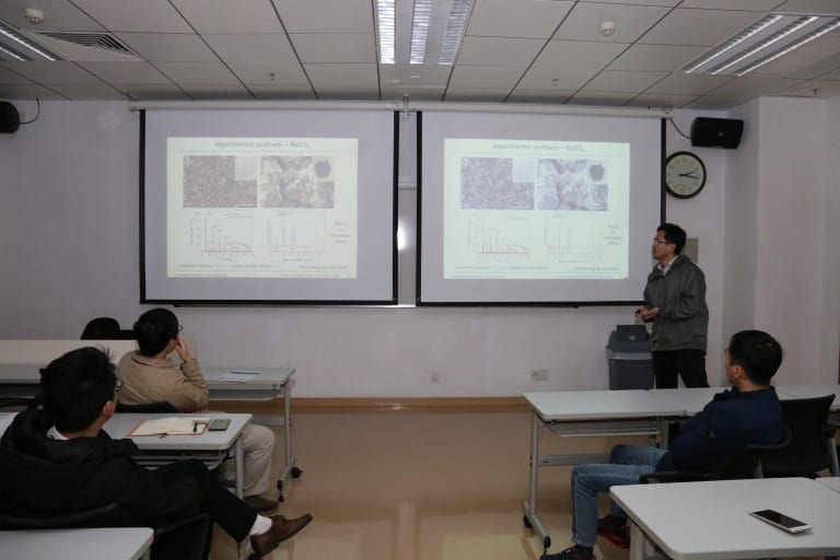 On 4th January, Prof. Yiyang SUN from the Shanghai Institute of Ceramics, Chinese Academy of Science, gave a talk titled “Chalcogenide Perovskites for Photovoltaics” at IAMPE. At the seminar, Prof. Sun introduced the calculation based exploration of chalcogenide-based perovskite materials for photovoltaics applications. The S or Se based perovskite materials show much better stability than their organic counterparts. He found several compounds, namely, CaTiS3, BaZrS3, CaZrSe3 and CaHfSe3, which could process suitable electronic properties for solar cell applications. One of these materials predicted, BaZrS3 was successfully synthesized with properties match calculation prediction. He concluded that Chalcogenide perovskites may have great potential in photovoltaics.