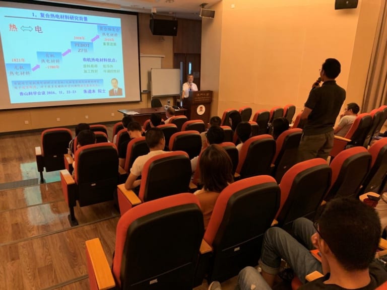 On 20 September, Prof. Guangming CHEN from Shenzhen University, was invited to give a talk entitled ” Thermoelectric Composites and Flexible Devices “. At the seminar, Prof. Chen introduced Thermoelectric (TE) materials. Thermoelectric (TE) materials can realize direct energy conversion between heat and electricity, having wide applications in heat generation, local cooling and sensors, etc. In particular, they are irreplaceable in harvesting waste or low-quality heat. In recent years, TE composites received significant attention and have become a hotspot in the fields of materials and energy.