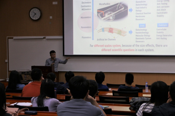 On 27 November, Prof. Xu HOU from Xiamen University, was invited to give a talk entitled ” Bio-inspired Multi-Scale Pores and Channels “. At the seminar, Prof. Hou introduced bioinspired and smart multiscale pore/channel systems. Ion channels existed in living organisms play a significant role in maintaining balanced physiological conditions and serve as “smart” gates to ensure selective ionic transport. Inspired by ion channels, various smart artificial nanochannel systems have been developed. Pore and channels are everywhere on different scales, ranging from biological ion channels to large oil pipelines. Stimulated by the achievements and the even larger potential of multiscale pores and channels systems, increasing research activities are devoted to important aspects such as energy saving, anti-fouling, anti-corrosion, and anti-blocking functionalities, switch ability and controllability integration of various functionalities, and good stability in such confined space.