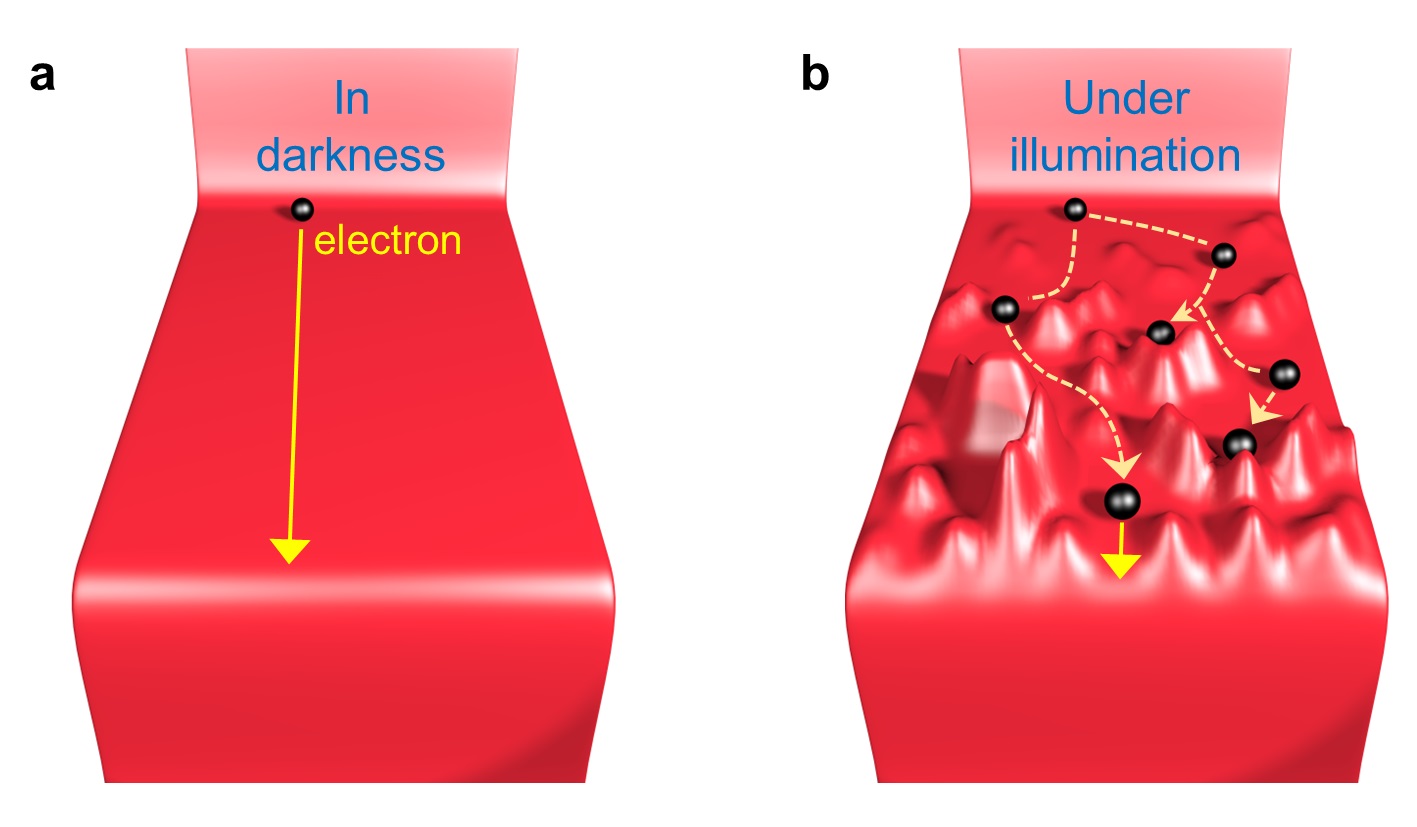 有鑒於此,兩校的研究團隊進行研究並首次揭示了混合二維/三維鈣鈦礦體系中獨特的光致載流子阻塞效應。研究發現,在黑暗條件下,二維鈣鈦礦組分不會阻礙載流子的傳輸;而在光照條件下,二維/三維鈣鈦礦界面的內建電場會增強,結合其鑲嵌式的相分佈規律,導致光生電子的傳輸被光致勢壘阻礙,而光生空穴則被光生陷阱俘獲。這一機制很好地解釋了混合二維/三維鈣鈦礦太陽能電池短路電流和填充因子低的現象。這一機制的提出,為優化混合二維/三維鈣鈦礦太陽能電池的性能提供了新的理論指導。