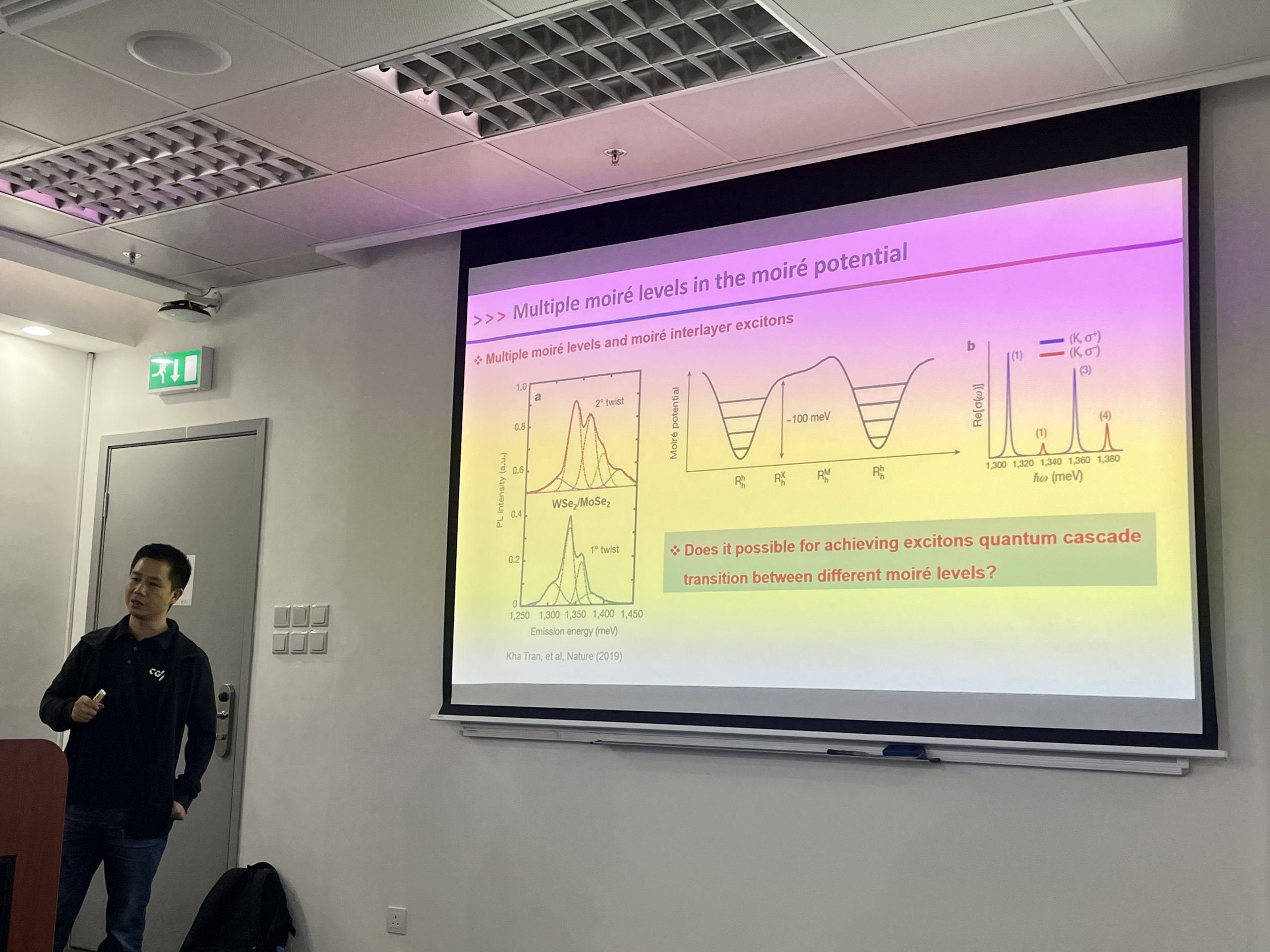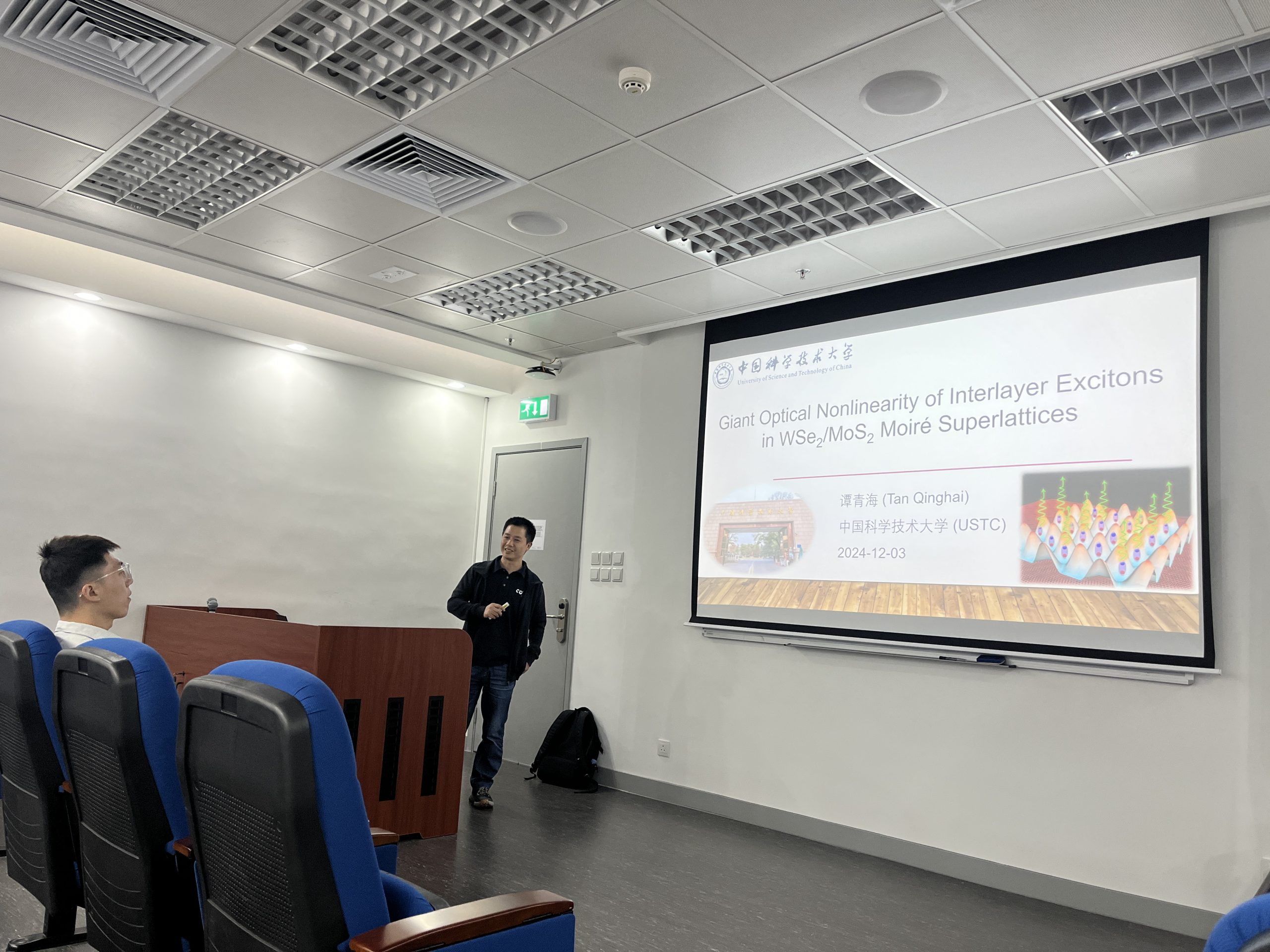 Prof. Tan first introduced moiré superlattices and their various novel physical phenomena and applications, such as superconductivity, the quantum anomalous Hall effect, and the fractional quantum anomalous Hall effect. He shared insights into cascade transitions and population inversion in moiré superlattices, as well as enhanced coherence within these structures. Lastly, he shared his experiences in developing new techniques and discovering new phenomena in scientific research.