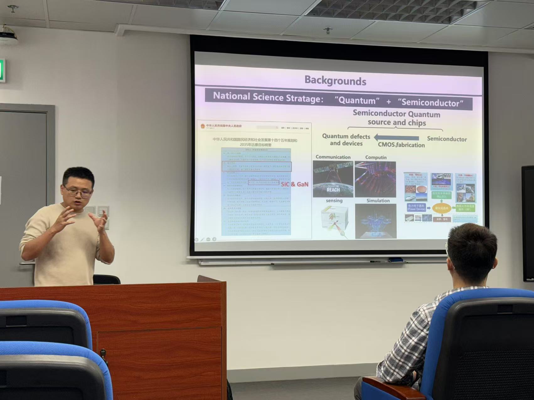 In his presentation, Prof. Zhou provided a comprehensive overview of recent advancements in the controlled preparation and coherent manipulation of silicon carbide (SiC) color centers on insulating substrates. He discussed the theoretical principles underpinning these techniques and their practical implementation. Prof. Zhou highlighted the successful coherent control of individual 13C nuclear spins on insulating SiC substrates, achieving near-unity polarization of single nuclear spins. Additionally, he demonstrated the integration of SiC quantum registers into photonic waveguides, realizing two-qubit entanglement with a maximally entangled state fidelity of 0.89 on an integrated photonic platform. His broader research interests include the exploration of scalable quantum photonic technologies and the application of SiC-based systems in quantum networks and quantum sensing.