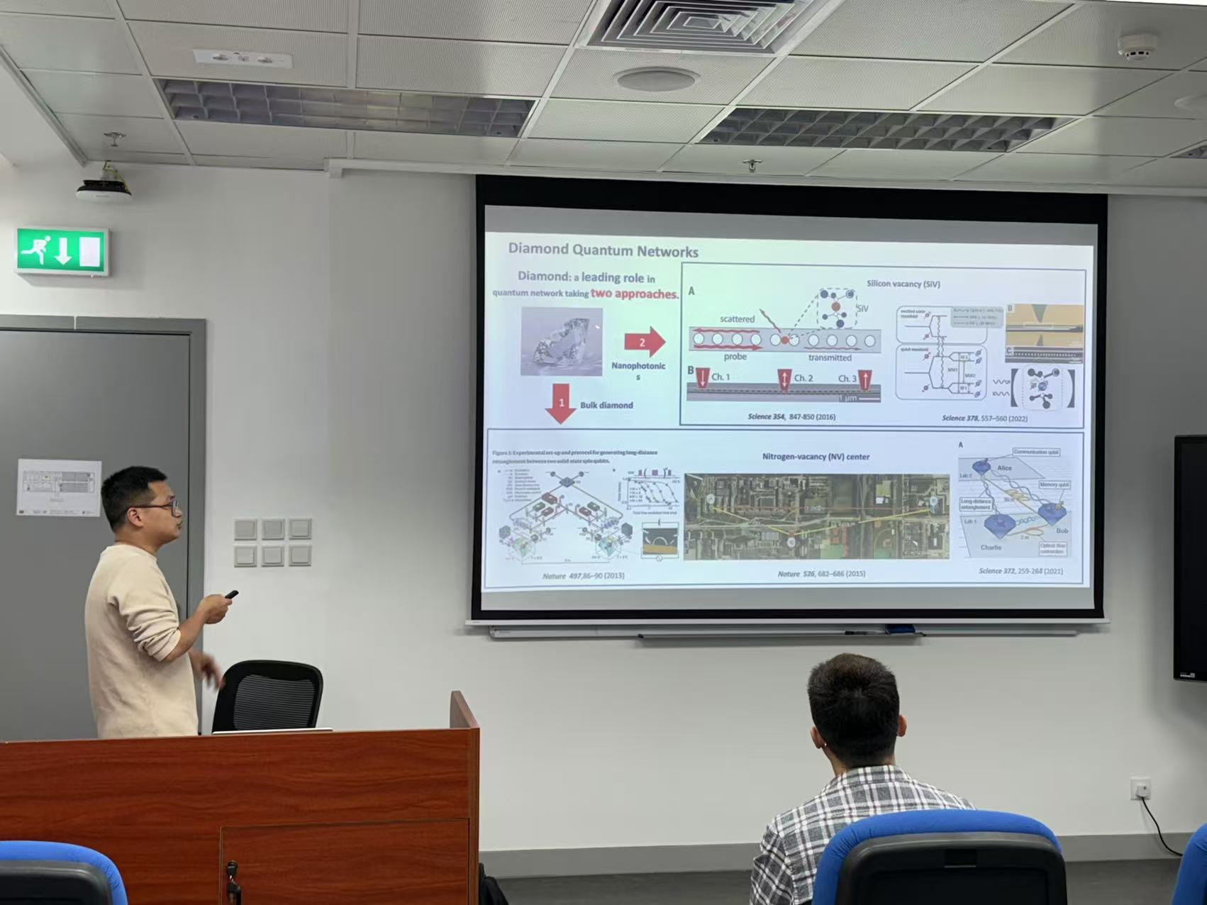 Prof. Yu Zhou, Professor of the School of Integrated circuit at the Harbin Insitute of Technology (Shenzhen), delivered an engaging talk on the “Room-Temperature Waveguide Integrated Quantum Register in a Semiconductor Photonic Platform” on 6 December 2024. Professor Zhou shared his latest breakthroughs in the field of silicon carbide integrated photonic quantum entanglement devices, advancing the application of integrated photonic quantum information technology in quantum networks and quantum sensing.