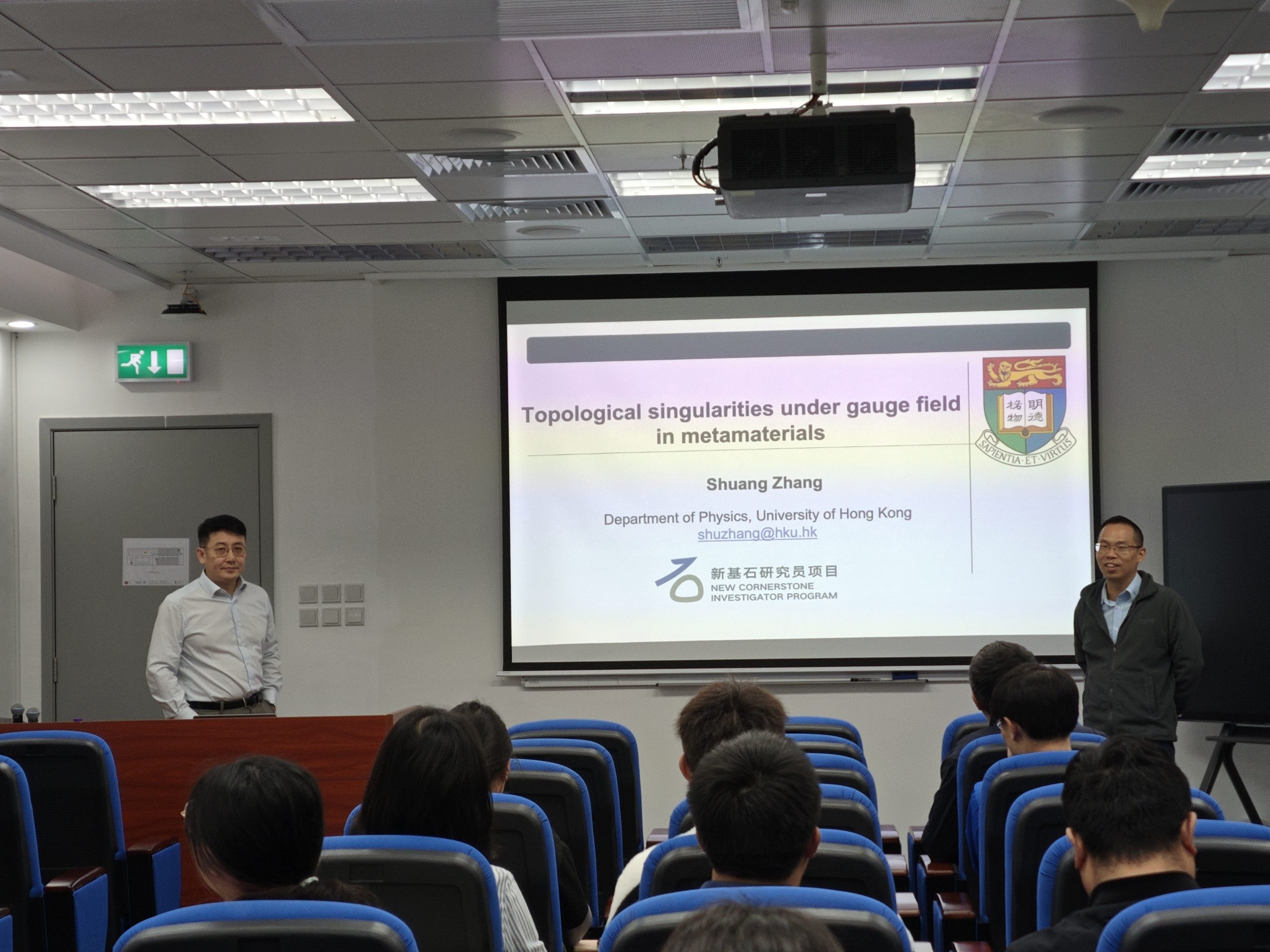 In the presentation, Prof. Zhang shared his recent research work on the topological photonics and metamaterials. After introducing the basic knowledge of topology in physics, he demonstrated various topological singularities, including Weyl points, Dirac points, Yang monopoles, and Berry dipoles, using metamaterials. He then particularly focus on the introduction of their interactions with artificially engineered gauge fields, facilitated by the flexibility in designing metamaterial properties.