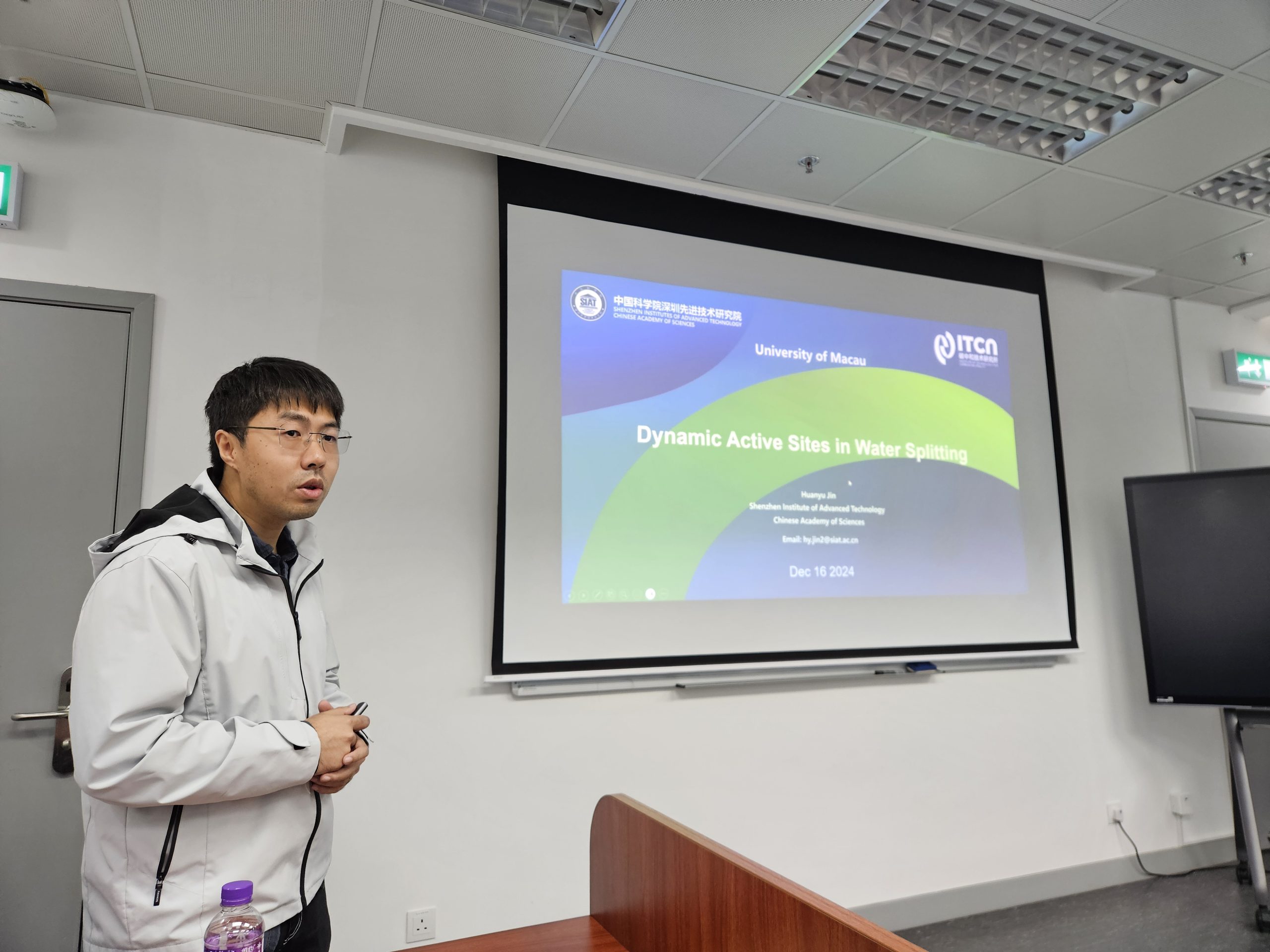Prof. Huanyu JIN, from the Shenzhen Institute of Advanced Technology, Chinese Academy of Sciences, presented a talk titled “Dynamic Active Sites in Water Splitting” at the Institute of Applied Physics and Materials Engineering on December 17, 2024. Prof. Jin is a Full Professor at the Shenzhen Institute of Advanced Technology, Chinese Academy of Sciences (CAS). Before joining CAS, he served as a lecturer at the Institute for Sustainability, Energy, and Resources at the University of Adelaide. His research is dedicated to the development of innovative nanomaterials for sustainable chemical production, water splitting, and various other applications in energy conversion and utilization. He has published over 60 papers in renowned international academic journals, over 30 as the first/corresponding author, in journals such as Chem. Rev., Sci. Adv., Nat. Commun., Adv. Mater., and Angew. Chem. He has garnered 10,000 total citations and an H-index of 41. He has received awards such as the Stephen Wilkins Medal and the JMCA Emerging Investigator. Prof. Jin is listed as Highly Cited Researcher and “Stanford/Elsevier’s Top 2% Scientist”.