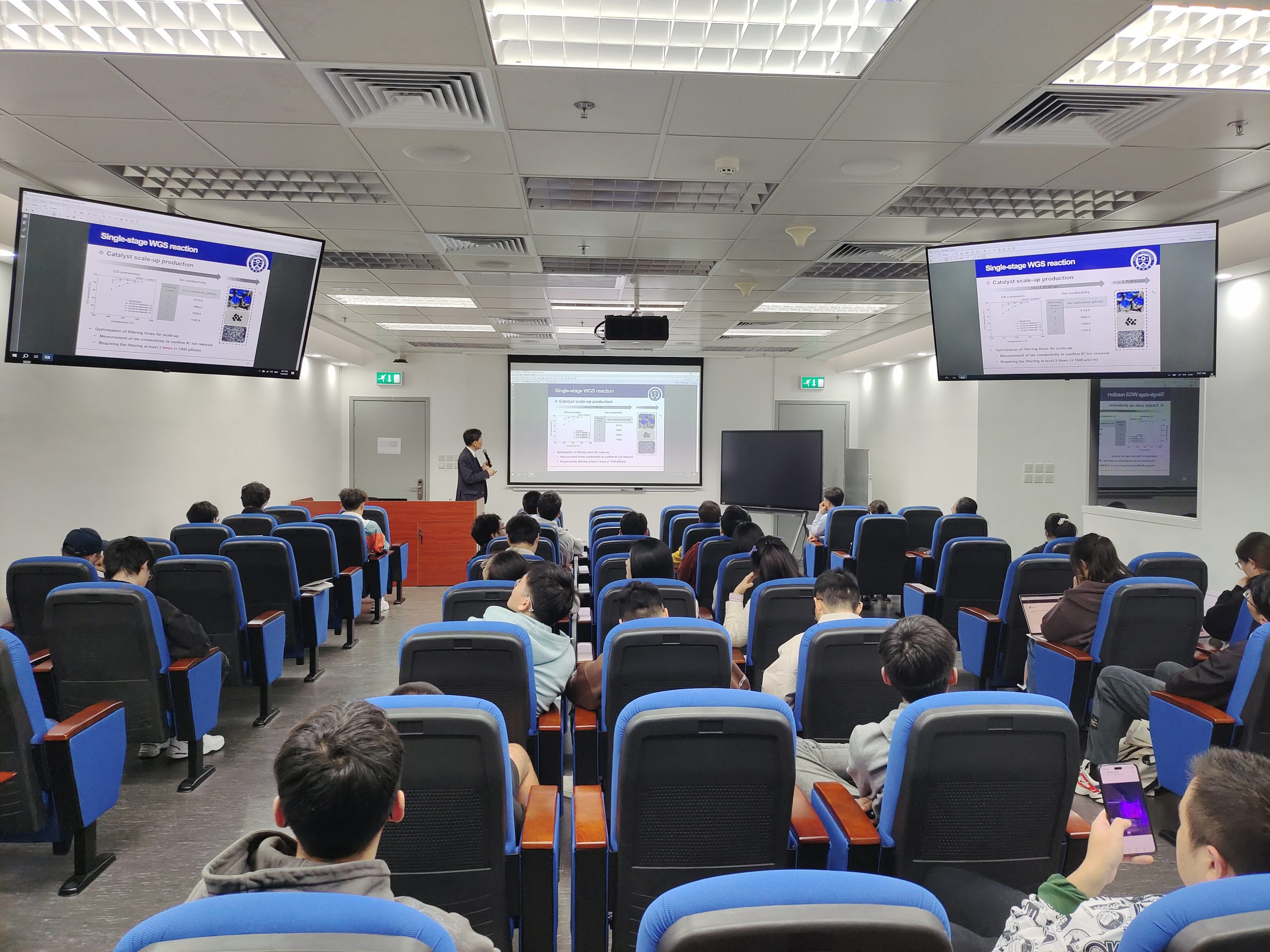 During the talk, Prof. Roh mentioned that green hydrogen is receiving special attention, and research on upcycling energy resources, including natural gas, coal, waste, and biomass, is in the spotlight. Catalytic reactions are often essential for producing high-value chemicals from these resources. The water–gas shift (WGS, CO + H2O → CO2 + H2) reaction is one of the most useful catalytic pathways for upcycling various types of synthesis gas. Currently, the application range of WGS reactions has further expanded to the upcycling of waste, biomass, and coal-derived synthesis gas. However, the reaction conditions and catalysts should be carefully customized for each resource by considering their characteristics. Prof. Roh presented his research on the reaction conditions and catalysts for the WGS reactions that have dealt with various types of feed gases over the last 10 years to understand the development progress. Based on the categorization (by the type of feed gas), the tested catalysts, capacity, temperature, feed gas composition, steam-to-carbon ratio, and catalyst performance were systematically discussed. The current research trends and perspectives for target-oriented WGS reactions in each type of feed gas source, which can give clues for customization were given at the end of his talk.