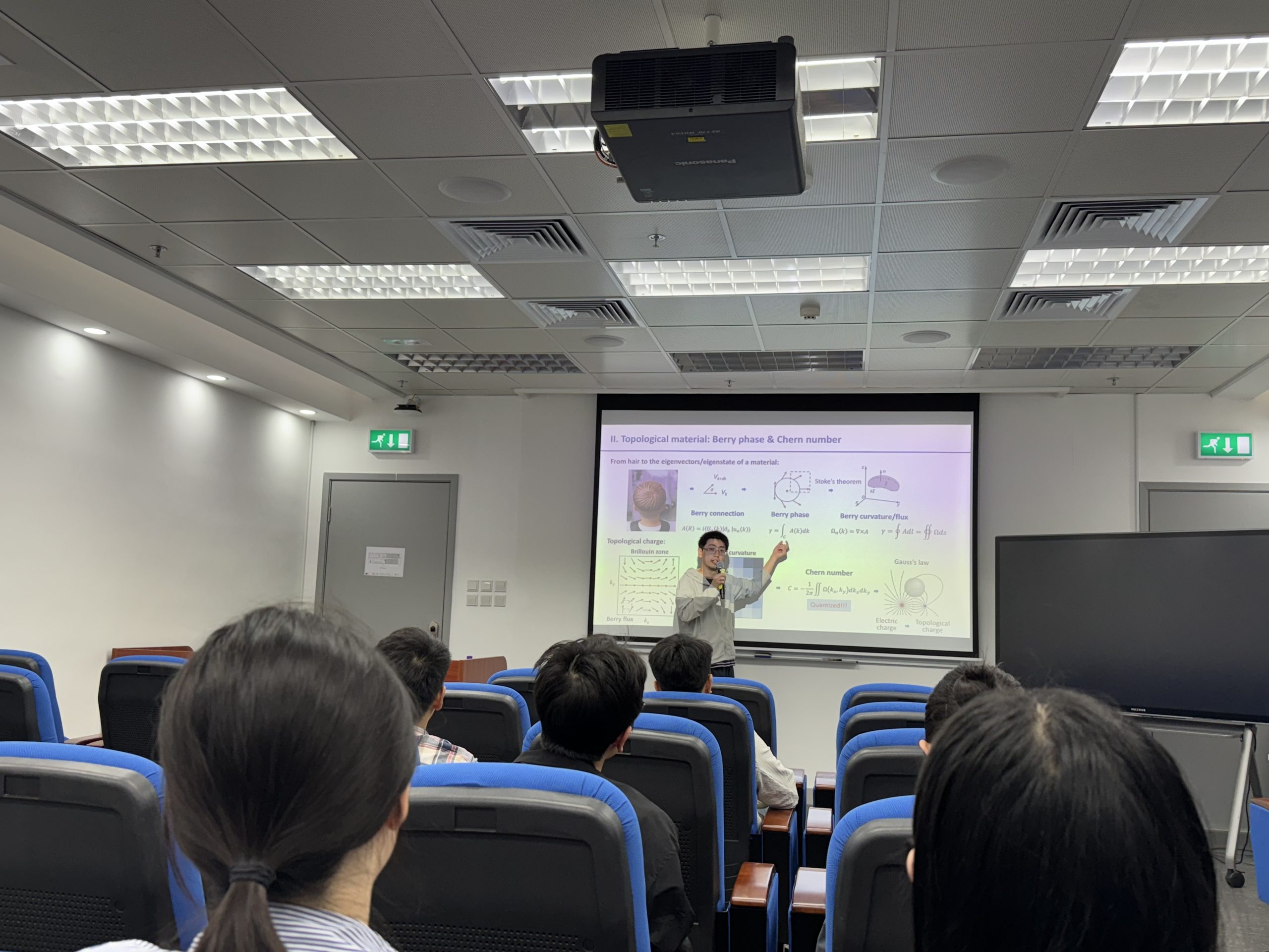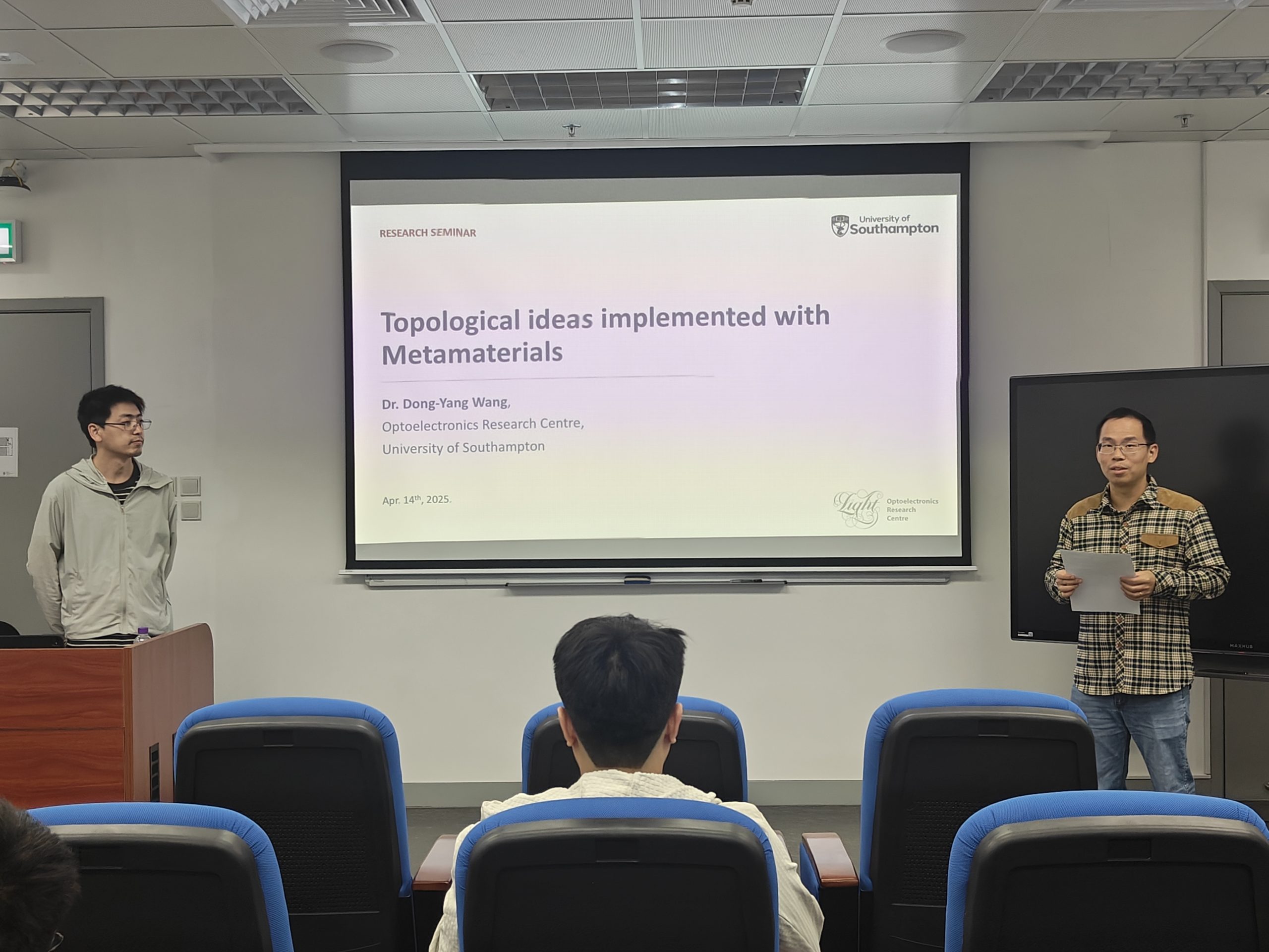 Dr. Dongyang Wang delivered a seminar entitled ‘Topological ideas implemented with metamaterials’. At the seminar, Dr. Wang firstly introduced how the geometrical concept, especially topology, is connected to materials. Then, he demonstrated a few examples on how topological invariants can be implemented with metamaterials. Further, he showed that the topological invariants can take the form of matrix and lead to non-Abelian characteristics. In the Q&A session, Dr. Wang had a zealous interaction with the audience.