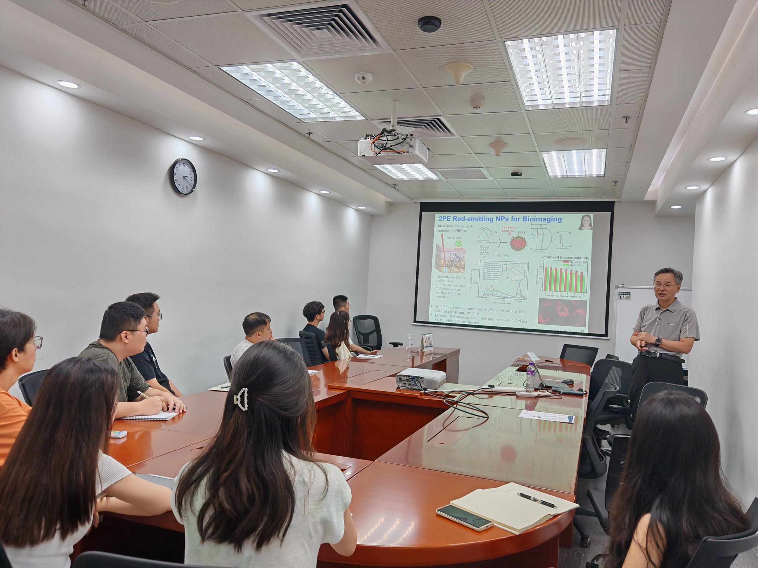 Following the presentation, participants engaged in a lively Q&A session, with in-depth discussions on two-photon excitation mechanisms, biocompatibility of nanomaterials, single-particle spectroscopy, and their applications in vivo imaging. Doctoral students and members of IAPME’s nano-optics research group explored potential collaborations with Prof. Xu in interdisciplinary fields such as optoelectronics, energy, and biomedicine.