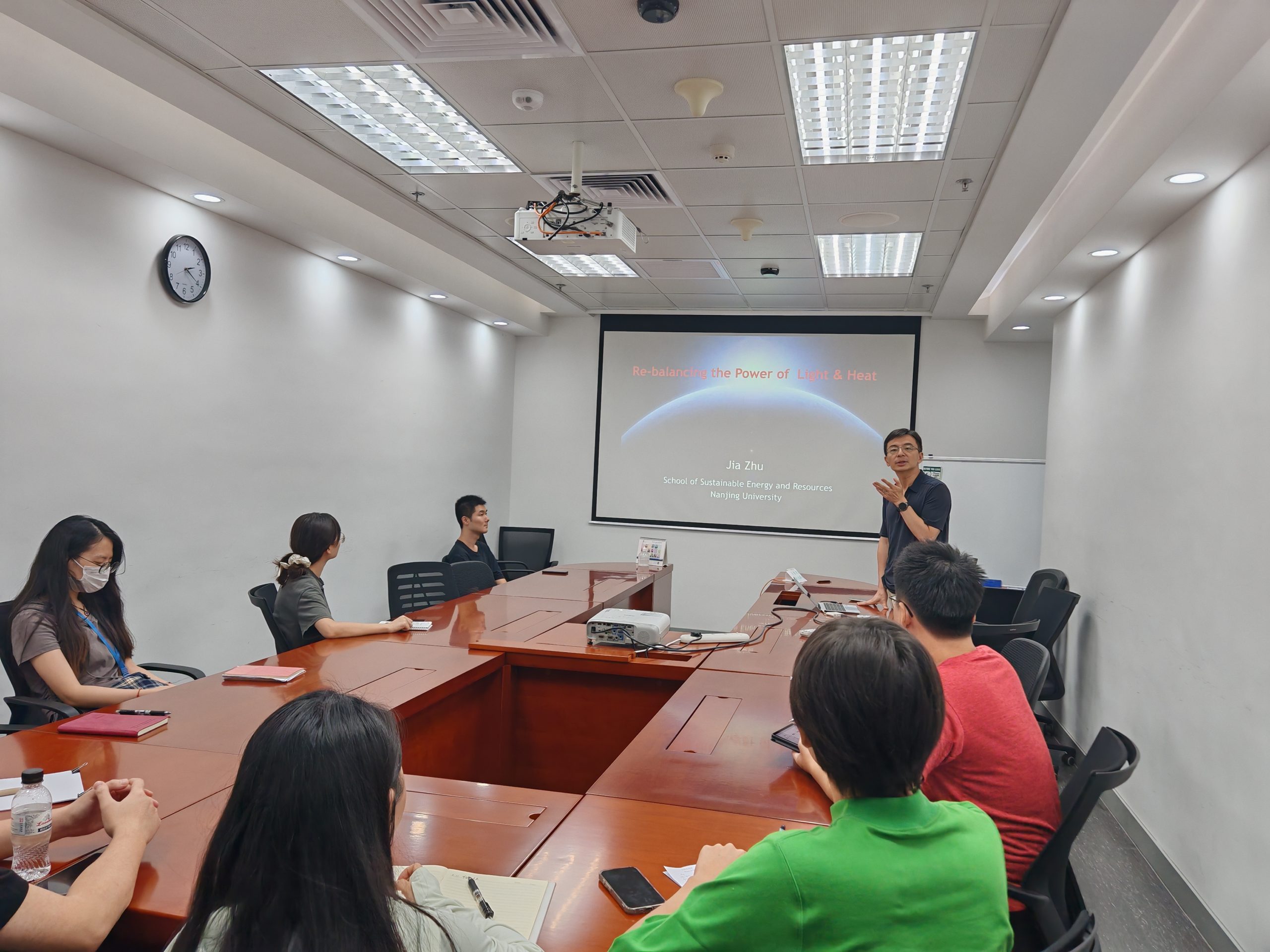 Prof. Jia Zhu (朱嘉) from Nanjing University gave a seminar to IAPME members on September 12, 2025. Prof. Zhu, currently a Professor, also a leading researcher in nanoscale manipulation of light and heat and a fellow of MRS, Optica, and RSC, delivered a talk titled “Manipulating the Flow of Light & Heat at Nanoscale,” drawing an audience of more than 20 institute members and students. The seminar was hosted by Prof. Guichuan Xing, who extended the invitation to Prof. Zhu.