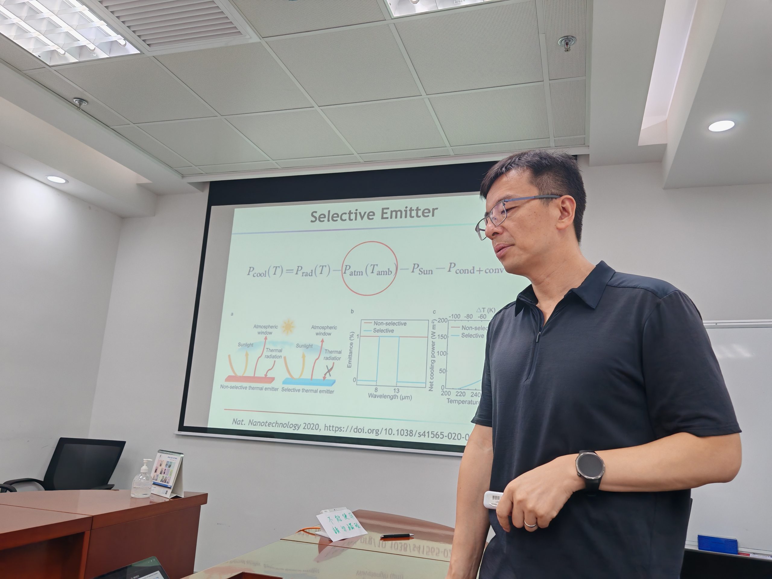 Prof. Zhu first surveyed his group’s progress in photothermal control inspired by Wiener optics and other nanophotonic strategies. He highlighted scalable, hierarchically designed selective thermal emitters and coating films engineered to align their emissivity with the Earth’s atmospheric transparency (thermal radiation) window. These radiative-cooling coverings can be deployed across diverse settings to passively reject heat to outer space, enabling all-day cooling without energy input and offering pathways to mitigate urban heat and improve device and building thermal management.