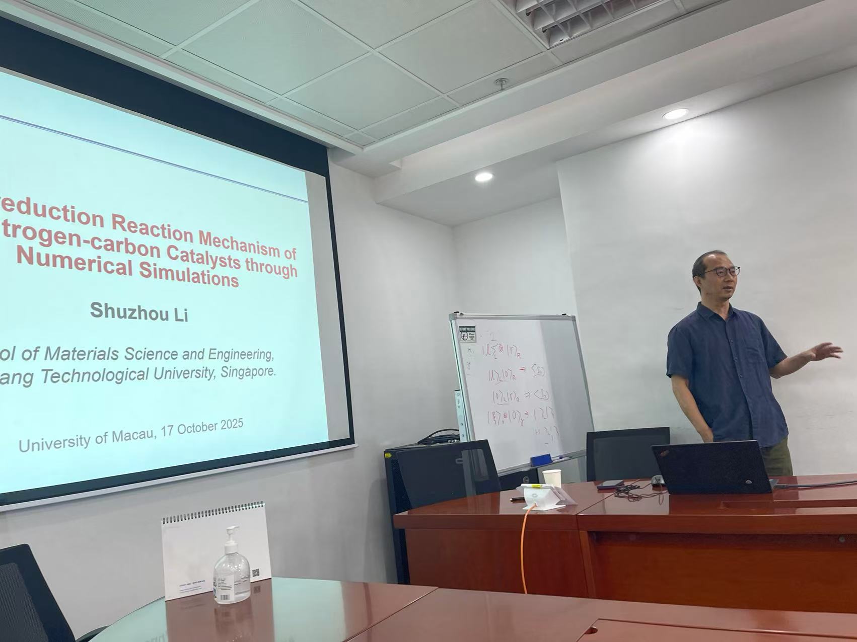 Prof. Shuzhou Li (李述周), Professor at Nanyang Technological University in School of Materials Science and Engineering, visited IAPME on October 17, 2025. During his visit, he delivered an insightful presentation titled “Electroreduction Reaction Mechanism of Metal-nitrogen-carbon Catalysts through Numerical Simulations” The seminar was hosted by Prof. Yongqing Cai, who extended the invitation to Prof. Li.