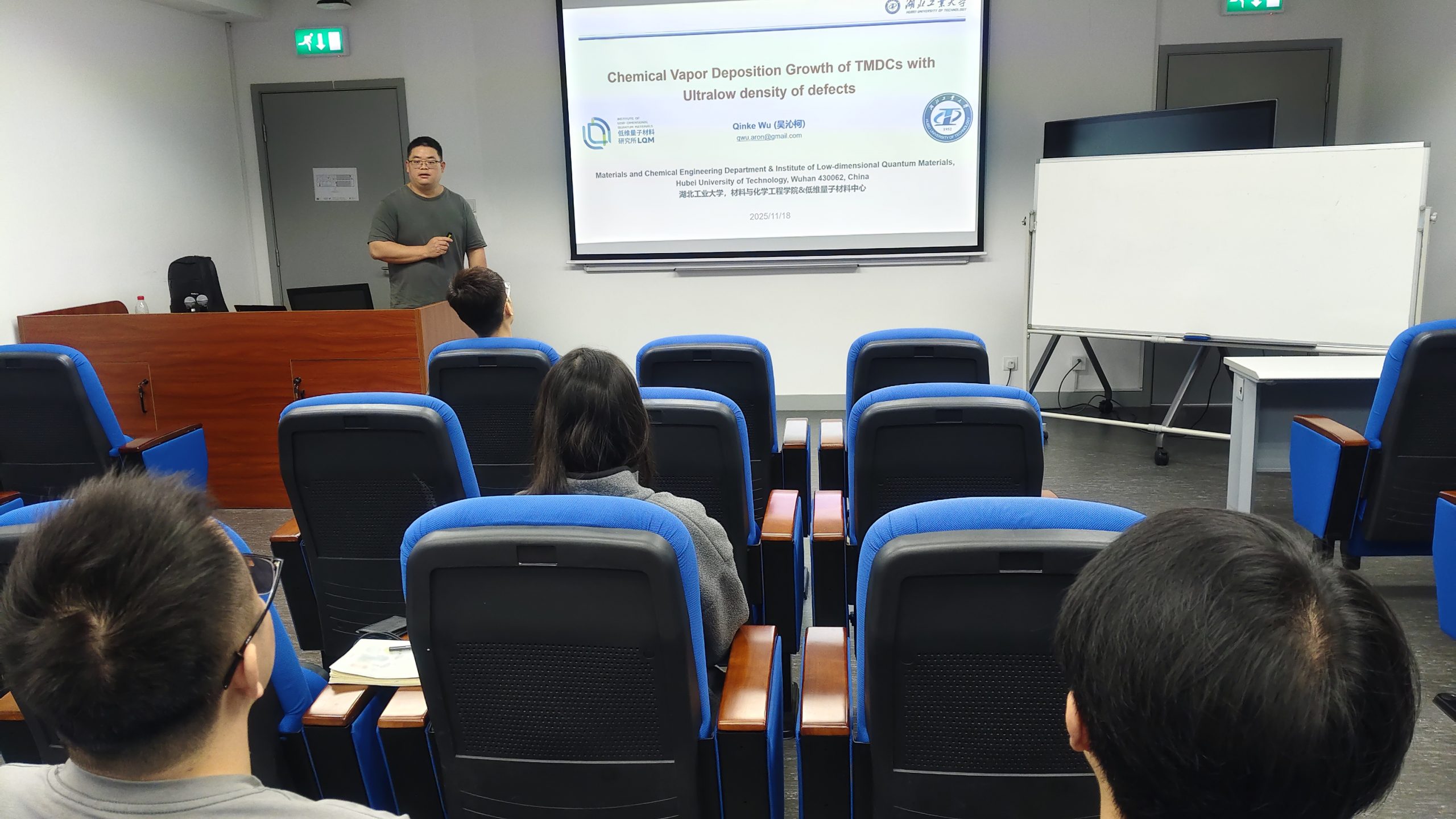 On November 18, 2025, Prof. Qinke Wu (吳沁柯) from Hubei University of Technology visited the Institute of Applied Physics and Materials Engineering (IAPME) and delivered a seminar titled “Chemical Vapor Deposition Growth of TMDCs with Ultralow Density of Defects” as part of the IAPME Seminar Series. The seminar took place at N23-4018 and was hosted by Prof. Shen Lai.